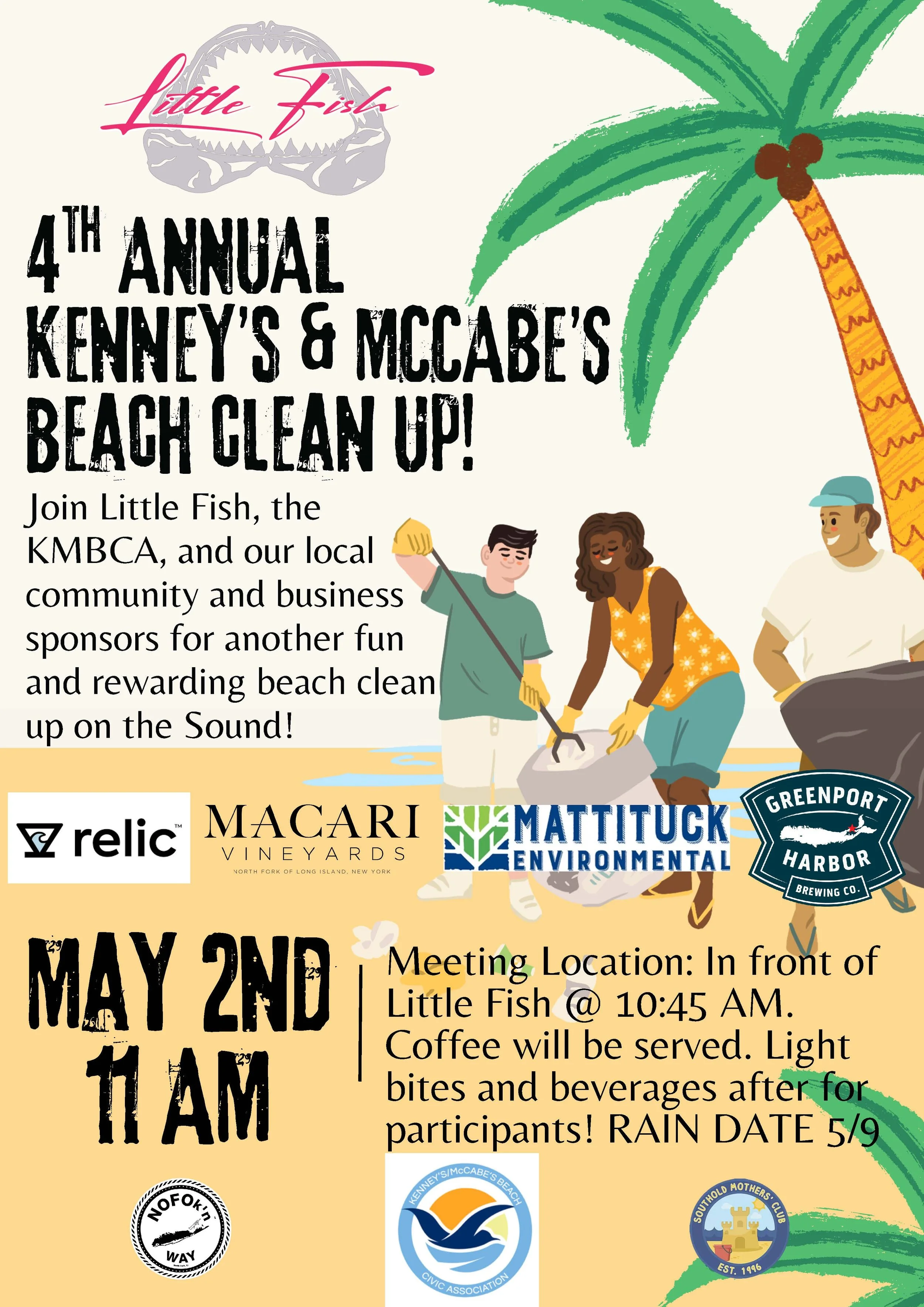 Our neighborhood restaurant Little Fish is sponsoring a Kenney’s/McCabe’s beach clean up and we're teaming up! Meet us and other great local groups in front of Little Fish on Sunday 5/4 @ 10:45 AM for coffee, then and help get the beach ready for the season. After party at Little Fish following the clean up!
